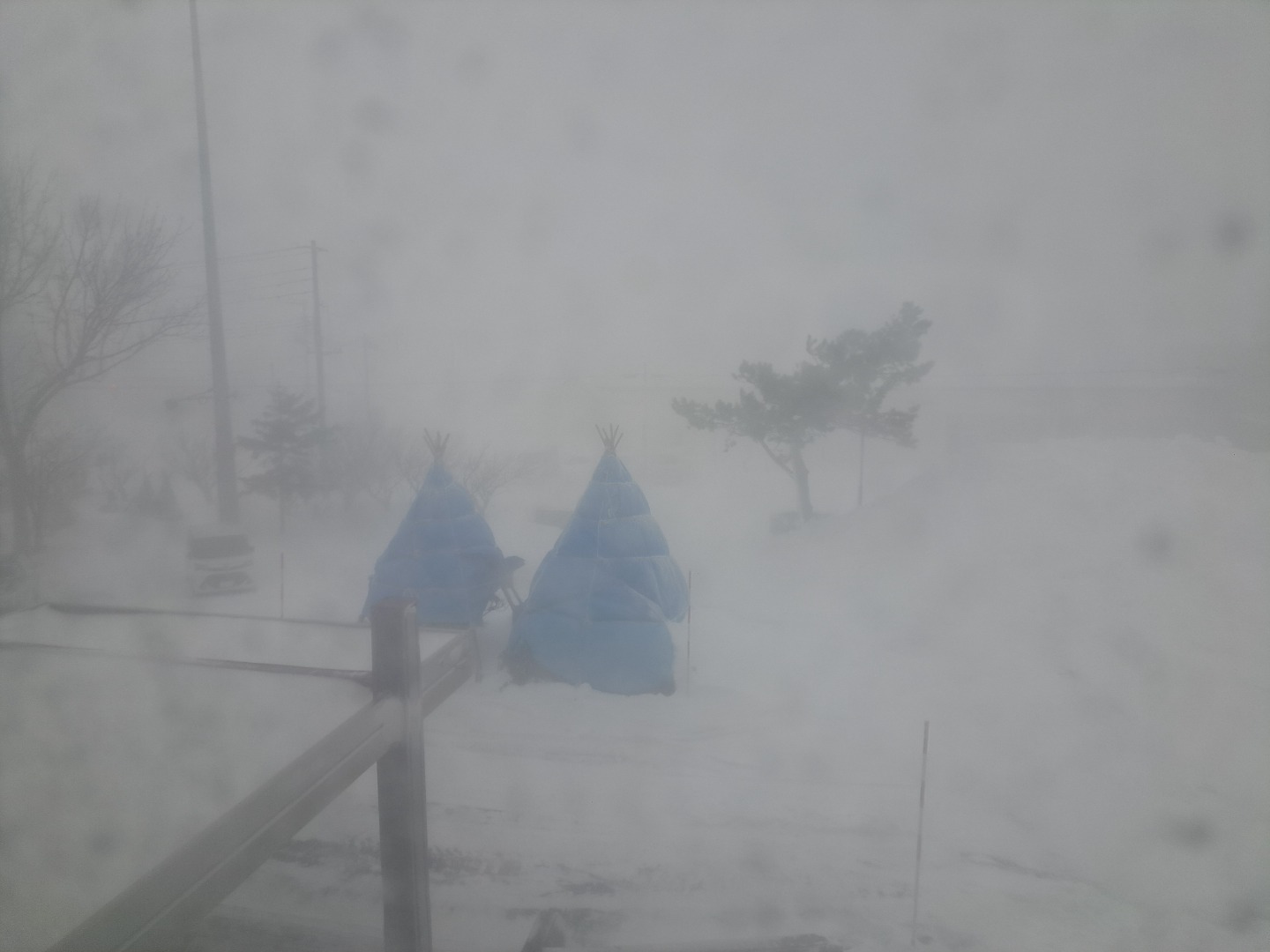 吹雪いて、道路が見えていません。